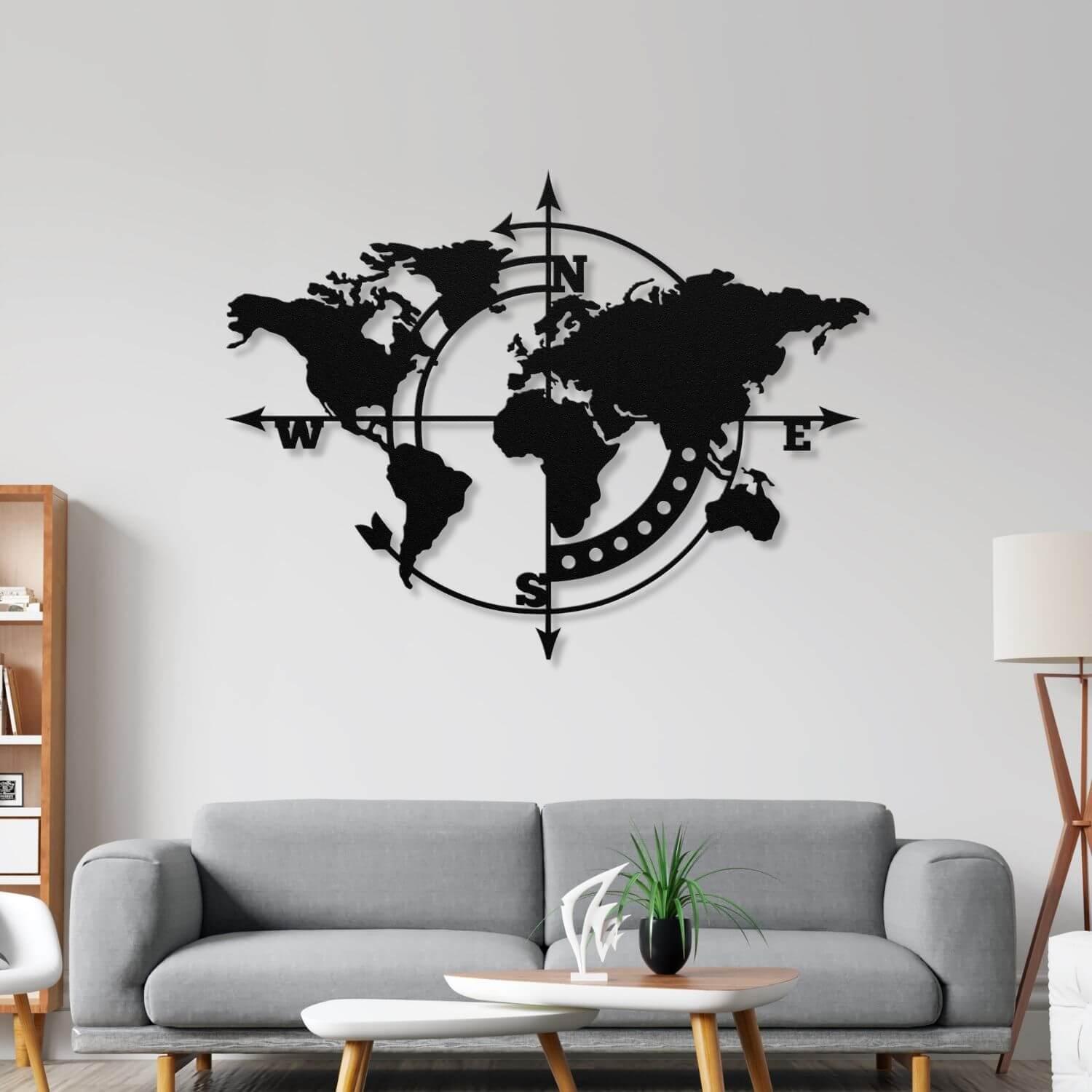 Metal World Map Wall Art World Map Compass Continent Metal Etsy